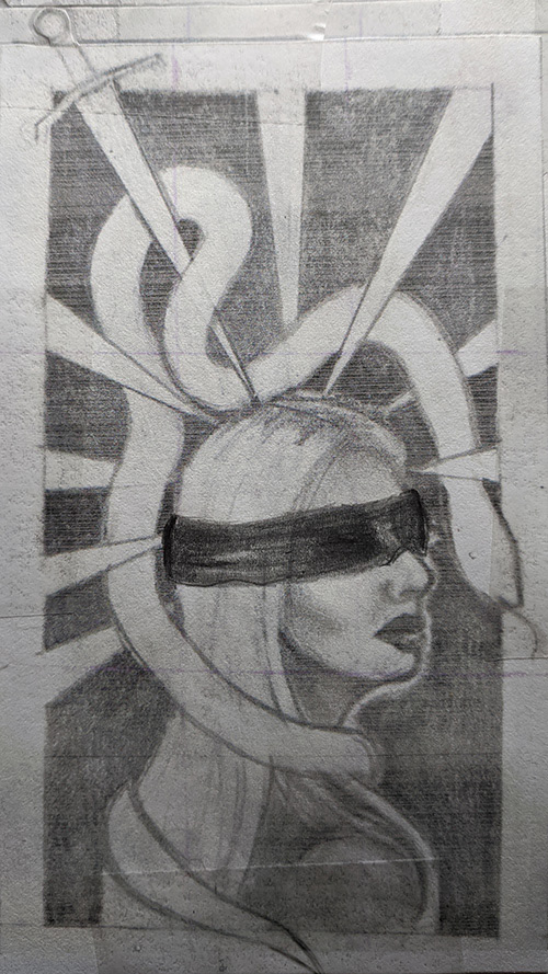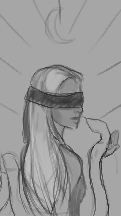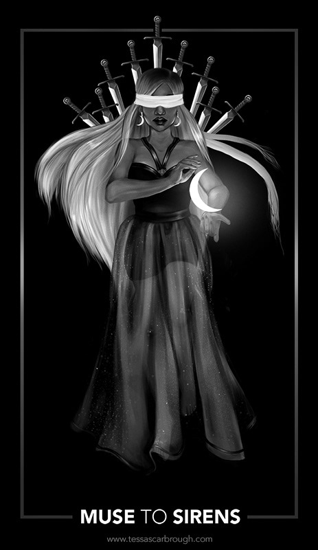 My friends wanted a custom tarot card to use for their band's merch. The artwork, which features lead singer Vanity, is a hybrid of The Moon and the Nine of Swords.